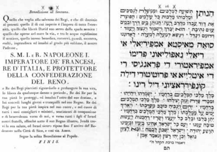 | Keywords: Napoleon Prayer.jpg en A Jewish prayer written by the Jews of Livorno Confederation of the Rhine for Napoleon on his 38th birthday in Hebrew and Italian Published in the Hod Malchut Glory of Sovereignty Siddur 1808 קונפדרציה ש הריין שנכתבה כבוד נפו יאון רג יו הו דתו ה-38 בעברית ובאיט קית הודפס בסידור הוד מ כות 1808 1808-01-15 Hod Malchut Glory of Sovereignty Livorno 1808 Jews of Livorno other versions PD-old-70-1923 Jewish Prayer for Royalty Confederation of the Rhine | ||||