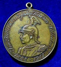 | Keywords: Napoleonic War Medal Battle of Großbeeren 1813, obverse.jpg en In the Battle of Großbeeren 23 August 1813 an allied Prussian-Swedish army under Crown Prince Charles John “ formerly Marshal of France Jean-Baptiste Bernadotte “ defeated the French under Marshal Oudinot Bronze medal for the inauguration of the memorial tower for the 100th anniversary of that battle D 46 mm Wilhelm II German Emperor King of Prussia 1888-1918 Portrait in uniform l around Im Jubiläumsjahr Kaiser Wilhelms · 1888 - 1913 · /The Art Nouveau monument dividing the date 23 Aug 1813 around 100 Jährig Jubel·Fest d Schlacht b Großbeeren Mint Otto Oertel Berlin Condition EXTREMELY FINE+ little tarnish 1913-08-23 own Berlin-George other versions cc-by-sa-4 0 Uploaded with UploadWizard PD-old-70 PD-1923 Wilhelm II of Germany on medals Numismatics Medals of Germany Medallions Prussia 1913 medals Großbeeren |