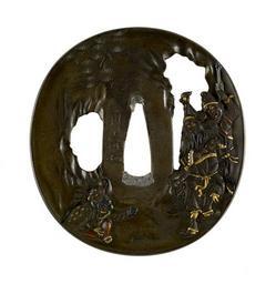 | Keywords: Nara Toshinaga I - Tsuba with Enshi (Ch Yen Tzu), One of the Twenty Four Paragons of Filial Piety - Walters 51305.jpg This tsuba depicts Enshi Ch Yen Tzu one of the twenty four paragons of filial piety from the Chinese Zhou Chou Dynasty 1122-255 BC Enshi's parents had a eye ailment that could only be cured by deer's milk His family was too poor to buy the expensive milk so Enshi disguised himself like a deer in order to get milk directly from does in the herd near his home The tsuba depicts two hunters on the right who almost kill Enshi because they think he really is a deer Enshi is on the left wearing a deer skin between 1667 1736 Edo shibuichi with gold and copper details lead cm 7 16 6 74 0 43 accession number 51 305 34261 Henry Walters Baltimore date and mode of acquistion unknown Walters Art Museum Henry Walters Acquired by Henry Walters Signature Toshinaga kao place of origin Edo present-day Tokyo Japan Walters Art Museum license Tosogu Japanese sword fittings in the Walters Art Museum Nara Toshinaga I Media contributed by the Walters Art Museum needs category review |