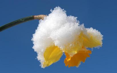 Keywords: narcissus blossom bloom daffodil spring yellow plant snow snow cover cold nature renewed wintereinbruch frost