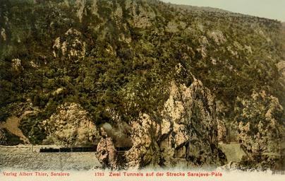 | Keywords: Narrow-Gauge-Railway Ostbahn Tunnels-No-7-6-5 West-of-Pale.jpg en Actually three tunnels are visible from left to right No 7 6 and 5 west of Pale on the stretch Pale - Dovlići Old postcard Albert Thier Sarajevo 1907 43 49 34 N 18 30 19 E heading SW PD-old-70-1923 Bosnian Eastern railway Postcards of Bosnia and Herzegovina Rail tunnels in Bosnia and Herzegovina Rail transport in Bosnia and Herzegovina in the 1900s | ||||