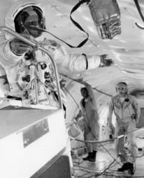 Keywords: An object floats from the hand of Buzz Aldrin, Apollo 11 LMP, during a weightlessness exercise in a KC-135 aircraft. Photo release date: July 10, 1969.