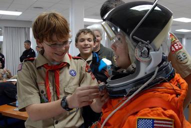 MAKE A MEME View Large Image NASA visits Rota DVIDS137503.jpg en Caleb Vietinghoff a Naval Station Rota Boy Scout from Troop 44 adjusts the visor on a space suit helmet for a volunteer during a visit with the NASA Space Shuttle Response Training Team Five children and ...