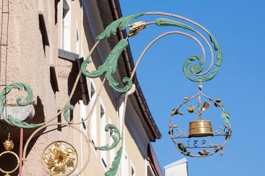 Keywords: nasal shield advertising advertising sign hauswand restaurant guild characters brewing guild symbols blacksmithing sideboard shield golden green germany wasserburg