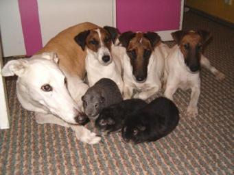 Keywords: Naši čtyřnožci.JPG Fox Terrier likes other animals - own Renáta Schwarzová CZ owner Fox Terrier Four dogs Dogs with other animals Cavia porcellus with other animals