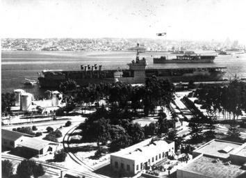 | Keywords: ship warship aircraft carrier aircraftcarrier united states navy unitedstatesnavy us navy usnavy usn aviation naval aviation navalaviation uss ranger (cv-4) ussrangercv4 uss ranger ussranger cv-4 cv4 uss jupiter (ac-3) ussjupiterac3 uss jupiter ussjupiter ac-3 ac3 uss langley (cv-1) usslangleycv1 uss langley usslangley cv-1 cv1 uss langley (av-3) usslangleyav3 av-3 av3 seaplane tender seaplanetender blackandwhite monochrome outdoor black and white NAS North Island, San Diego, CA. View from Air Station tower, looking toward the city, circa late 1930's. USS RANGER (CV 4) is at the Air Station pier, with a P2Y seaplane on the water just astern. USS LANGLEY (AV 3) is offshore, with a PBY overhead. Photo courtesy of the Naval Historical Center. Repository: San Diego Air and Space Museum Archive NAS North Island, San Diego, CA. View from Air Station tower, looking toward the city, circa late 1930's. USS RANGER (CV 4) is at the Air Station pier, with a P2Y seaplane on the water just astern. USS LANGLEY (AV 3) is offshore, with a PBY overhead. Photo courtesy of the Naval Historical Center. Repository: San Diego Air and Space Museum Archive |