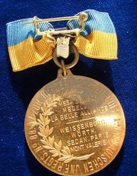 | Keywords: Nassau Medal 100th 2nd Regiment Anniversary 1808 - 1908. Reverse.jpg en Gilt Silver d 39 mm Friedrich August Duke of Nassau 1803 - 1816 and Wilhelm II German Emperor 1888 - 1918 2 busts l around in 1 to 2 lines FRIEDRICH AUGUST HERZOG ZU NASSAU KAISER WILHELM II 13 AUGUST 1808-1908 / 7 lines of battle names fought by the regiment MESA DE JBOR MEDELLIN LA BELLE ALLIANCE - WEISSENBURG WÖRTH SEDAN PARIS MONT VALERIEN Surrounding ZUR HUNDERTJAHRFEIER DES II NASSAUISCHEN JNF RGTS NO 88 Condition EXTREMELY FINE No hidden faults 2015-04-11 16 50 18 own Berlin-George other versions cc-by-sa-4 0 Uploaded with UploadWizard This photo PD-EU-no author disclosure PD-old-70-1923 Wilhelm II of Germany on medals Numismatics 1908 medals Medals of Germany Militaria Commemorative medals |