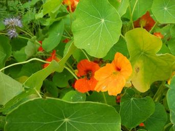Keywords: nasturtium bees garden blossom bloom orange leaves