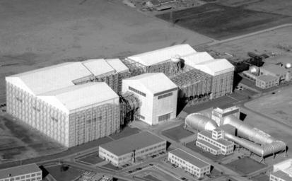 | Keywords: blackandwhite monochrome black and white (A-13516): This aerial view shows the 40 x 80 Full-Scale Tunnel towering over the 6- by 6-Foot Supersonic Tunnel (R) and the 16-Foot High-Speed Tunnel (lower R). The tunnel’s external steel framework and asbestos-cement walls are readily evident. The central structure with no external structure houses the test section. The non-rectangular contraction, diffuser, and fan sections were fabricated entirely of steel. (A-13516): This aerial view shows the 40 x 80 Full-Scale Tunnel towering over the 6- by 6-Foot Supersonic Tunnel (R) and the 16-Foot High-Speed Tunnel (lower R). The tunnel’s external steel framework and asbestos-cement walls are readily evident. The central structure with no external structure houses the test section. The non-rectangular contraction, diffuser, and fan sections were fabricated entirely of steel. |