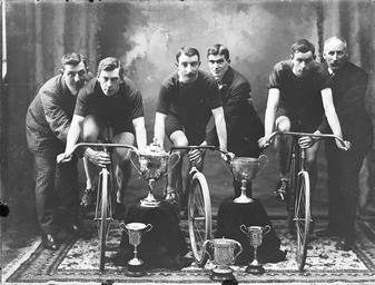 | Keywords: south eastern wheelers southeasternwheelers cycling bicycles sport cyclists moustaches cups awards silverware tyler challenge cup tylerchallengecup south of ireland challenge cup southofirelandchallengecup sunday 4th july 1909 1900s 20th century 20thcentury a.h. poole ahpoole arthur henri poole arthurhenripoole glass negative glassnegative waterford bicycle club waterfordbicycleclub national library of ireland nationallibraryofireland poole photographic collection poolephotographiccollection people groupshot blackandwhite monochrome team sport musician performer public domain blackandwhite monochrome sport team sport people performer musician black and white John Spooner, of this parish, suggested "In commemoration of Ireland's first track cycling medal since 1896, (a silver won by Martyn Irvine two weeks ago in Minsk, followed an hour later by a gold) how about a picture with some bicycles..." Presenting therefore the South Eastern Wheelers from Waterford Bicycle Club! Think that this photo was ordered by a Mr Keane, perhaps of Henrietta Street, Waterford. As to the silverware, from what I can make out of the wording: Squat one on the ground (middle) = The "Tyler" Challenge Cup, 1909 Tall one on the ground (right) = South Eastern Wheelers One on stand (right) = W B C South of Ireland Challenge Cup Date: Sunday, 4 July 1909 NLI Ref: POOLEWP 1945 You can also view this image, and many thousands of others, on the NLI’s catalogue at catalogue.nli.ie John Spooner, of this parish, suggested "In commemoration of Ireland's first track cycling medal since 1896, (a silver won by Martyn Irvine two weeks ago in Minsk, followed an hour later by a gold) how about a picture with some bicycles..." Presenting therefore the South Eastern Wheelers from Waterford Bicycle Club! Think that this photo was ordered by a Mr Keane, perhaps of Henrietta Street, Waterford. As to the silverware, from what I can make out of the wording: Squat one on the ground (middle) = The "Tyler" Challenge Cup, 1909 Tall one on the ground (right) = South Eastern Wheelers One on stand (right) = W B C South of Ireland Challenge Cup Date: Sunday, 4 July 1909 NLI Ref: POOLEWP 1945 You can also view this image, and many thousands of others, on the NLI’s catalogue at catalogue.nli.ie Public Domain: National Library of Ireland on The Commons Public Domain: National Library of Ireland on The Commons |