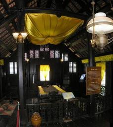 | Keywords: National Museum KL 2008 Istana interior pano.jpg The guest hall of the Istana Satu First Palace is furnished with a cupboard that is made of carved wood with gold inlaid and complete with a mirror The cupboard is used to store small decorative items A hanging lamp is positioned from ceiling A brass foot tray with legs is placed in the hall of visitors Spread out is a mat made out of mengkuang leaves a Malay feature to honour guests Adding to the royal ambience of the central hall are brass shields mounted on the left and right walls The kitchen of the Istana Satu First Palace is made from wood carved with floral motifs Arranged on the table are a food cover made of woven mengkuang leaves and brass tray symbolising the pride and identity of the Malay race together with a glass lamp The cupboard is where the kitchen utensils are stored The decorative items are simple yet full of artistic and cultural meaning Own 2008-01 Gryffindor Istana Satu |