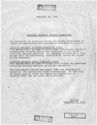 | Keywords: National Security Council Directives - NARA - 198167.tif Scope and content General notes 198167 Local identifier President 1981-1989 Reagan National Security Council 1981 - 1989 Ronald Reagan Library NLRR 40 Presidential Drive Simi Valley CA 93065-0600 1981-02-25 Record group Collection RR-NSC Numbered National Security Policy Papers 1981 - 1989 Record group ARC 1189 National Security Decision Directives compiled 02/25/1981 - 01/19/1989 Series ARC 198166 File unit File unit ARC Variant control numbers NAIL Control Number NLS-NSC-NSDD-1 yes Other versions <gallery> File National_Security_Council_Directives_-_NARA_-_198167 tif tif File National_Security_Council_Directives_-_NARA_-_198167 jpg jpg </gallery> NARA-cooperation PD-USGov Presidential Decision Directives Reagan NARA TIF images with categorized JPGs |