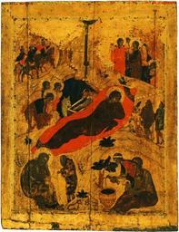 | Keywords: Nativity (15th c., Annunciation Cathedral in Moscow).jpg Рождество Х истово Из п аздничного чина Школа или худ цент осква ачало XV в 1410-е гг 81 × 62 см Благовещенский cобо осковского К емля осква Россия Инв 3244 соб/ж-1397 Из п аздничного я уса иконостаса собо а Лаза ев отмечал инте есное изменение внесенное в этой иконе в т адиционную иконог афию Рождества Х истова славословящие ангелы помещены не в левом ве хнем углу композиции как мы это обычно находим в византийских изоб ажениях а п едставлены склоненными около яслей к кото ых покоится ладенец Тем самым они становятся п ямыми участниками акта поклонения ово ожденному что вносит совсем новый более интимный эмоциональный оттенок в изоб аженную сцену Лаза ев 1966 ст 111 Позднее Алпатов указал что мотив ангелов поклоняющихся ладенцу в яслях имеется во ф еске на ту же тему в це кви Пе ивлепты в ист е Алпатов 1978 ст 297 Nativity of the Lord Icon by St Andrei Rublev 1405 Cathedral of the Annunciation Moscow Kremlin From http //lj rossia org/users/john_petrov/654558 html PD-old-100 Icons of the nativity of Jesus Christ Midwife Salome Swaddling in paintings Main iconostasis of Annunciation Cathedral in Moscow P02 Artworks missing infobox template Icons formerly attributed to Andrej Rublëv |