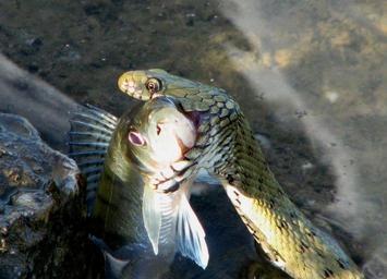 Keywords: Natrix tesselata with a perch.JPG en The dice snake with its prey a perch in the Brno reservoir own photo HTO 2013-07-21 Brno Reservoir Perca Natrix tessellata eating