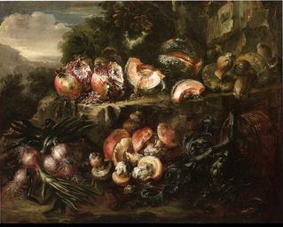 Keywords: Natura morta di frutta e verdure.jpg en Painting Still Life of Fruit and Vegetables it Dipinto di Natura Morta di Frutta e Verdura Dipinto Creator Felice Boselli XVII - XVIII Secolo PD-old-100 Felice Boselli