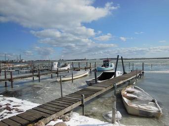 Keywords: natural harbor jetty ice water winter blue sky white clouds boats fishing boats calm tranquility nature landscape white blue brown