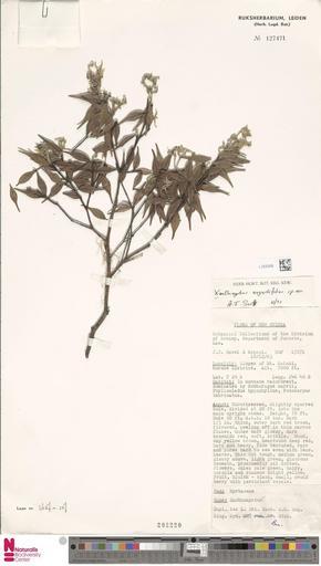 | Keywords: Naturalis Biodiversity Center - L.2532508 - Xanthomyrtus angustifolia A.J.Scott - Myrtaceae - Plant type specimen.jpeg artwork Dimensions artwork Document type 2133 m Myrtaceae Xanthomyrtus Brambach F Individual count Infraspecific epithet Infraspecific rank Institution Naturalis Kind of unit artwork Kind of unit specimen Life stage New Guinea Slopes of Mt Kaindi Morobe District Lat -7 3 S Long 146 667 E Medium artwork Nomenclatural code Unbuttresses slightly spurred bole divided at 20 ft into the main upright stems Height 70 ft Bole 20 ft d b h 18 ins Bark 1/3 in thick outer bark red brown fissured peeling off in thin narrow flakes under bark glossy dark brownish red soft brittle Wood sap yellow brown heartwood deep red hard and heavy fine textured rays and pores hard to see even with lens Leaves thin but tough medium green glossy above light green glabrous beneath prominently oil dotted Flowers calex pale green hairy corolla and stamens bright yellow Fruit bluish-black small ovoid berry with persistant sepals In montane rainforest dominated by Nothofagus carrii Phyllocladus hypophyllus Podocarpus imbricatus Alt 7000 ft Occurrence ID page Other fields Other versions artwork Permission license Naturalis donation CC0 Publication location Scientific name Xanthomyrtus angustifolia A J Scott type of - Xanthomyrtus angustifolia A J Scott species Scientific name authorship A J Scott Source url http //bioportal naturalis nl Specific epithet angustifolia State or province New Guinea Morobe Kaindi Subject keywords artwork Subject keywords publication Title artwork Title publication Type status isotype 0-5-2014 dmy Uploaded with GWToolset Naturalis_Biodiversity_Center_-_L 2532508_-_Xanthomyrtus_angustifolia_A J Scott_-_Myrtaceae_-_Plant_type_specimen http //medialib naturalis nl/file/id/L 2532508/format/large Media donated by Naturalis Biodiversity Center Plant type specimens at Naturalis Biodiversity Center Xanthomyrtus angustifolia Xanthomyrtus |
