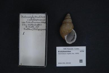 | Keywords: Naturalis Biodiversity Center - RMNH.MOL.309160 - Dolichostyla virgata (Jay, 1839) - Bradybaenidae - Mollusc shell.jpeg artwork Dimensions artwork Document type Bradybaenidae Dolichostyla Individual count Infraspecific epithet Infraspecific rank Institution Naturalis Kind of unit artwork Kind of unit specimen shell Life stage Medium artwork Nomenclatural code Source institute Rijksmuseum van Natuurlijke Historie Leiden Scale the width of the text on the species/QR-code label is 38 mm Occurrence ID page Other fields Other versions artwork Permission license Naturalis donation CC-0 Mollusca Publication location Scientific name Dolichostyla virgata Jay 1839 Scientific name authorship Jay 1839 Source url http //bioportal naturalis nl Specific epithet virgata State or province Subject keywords artwork Subject keywords publication Title artwork Title publication Type status Uploaded with GWToolset Naturalis_Biodiversity_Center_-_RMNH MOL 309160_-_Dolichostyla_virgata_ Jay _1839 _-_Bradybaenidae_-_Mollusc_shell http //medialib naturalis nl/file/id/RMNH MOL 309160/format/large Media donated by Naturalis Biodiversity Center Molluscs at Naturalis from the Rijksmuseum van Natuurlijke Historie Dolichostyla virgata Dolichostyla |