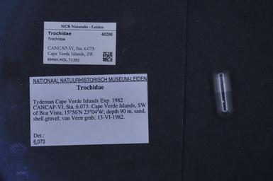 | Keywords: Naturalis Biodiversity Center - RMNH.MOL.71392 - Trochidae - Trochidae - Mollusc shell.jpeg artwork Dimensions artwork Document type Trochidae Trochidae Individual count Infraspecific epithet Infraspecific rank Institution Naturalis Kind of unit artwork Kind of unit specimen shell Life stage CANCAP-VI Sta 6 073 Cape Verde Islands SW of Boa Vista; 15°56'N 23°04'W; depth 90 m sand shell gravel; van Veen grab; 13 vi 1982 Medium artwork Nomenclatural code Source institute Rijksmuseum van Natuurlijke Historie Leiden Scale the width of the text on the species/QR-code label is 38 mm Occurrence ID page Other fields Other versions artwork Permission license Naturalis donation CC-0 Mollusca Publication location Scientific name Trochidae Scientific name authorship Source url http //bioportal naturalis nl Specific epithet State or province Boa Vista Subject keywords artwork Subject keywords publication Title artwork Title publication Type status Uploaded with GWToolset Naturalis_Biodiversity_Center_-_RMNH MOL 71392_-_Trochidae_-_Trochidae_-_Mollusc_shell http //medialib naturalis nl/file/id/RMNH MOL 71392/format/large Media donated by Naturalis Biodiversity Center Molluscs at Naturalis from the Rijksmuseum van Natuurlijke Historie Trochidae Trochidae |