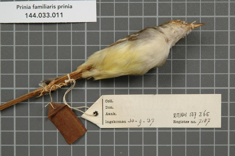 | Keywords: Naturalis Biodiversity Center - RMNH.AVES.137365 2 - Prinia familiaris prinia (Temminck, 1822) - Sylviidae - bird skin specimen.jpeg artwork Dimensions artwork Document type Sylviidae Prinia Individual count 1 Infraspecific epithet prinia Infraspecific rank Institution Naturalis Kind of unit artwork Kind of unit specimen skin Life stage Tjiplokan dessa soemberdja Medium artwork Nomenclatural code Occurrence ID page Other fields Other versions artwork Permission license Naturalis donation CC-0 Publication location Scientific name Prinia familiaris prinia Temminck 1822 Scientific name authorship Temminck 1822 male Source url http //bioportal naturalis nl Specific epithet familiaris State or province Subject keywords artwork Subject keywords publication Title artwork Title publication Type status Uploaded with GWToolset Naturalis_Biodiversity_Center_-_RMNH AVES 137365_2_-_Prinia_familiaris_prinia_ Temminck _1822 _-_Sylviidae_-_bird_skin_specimen http //medialib naturalis nl/file/id/RMNH AVES 137365_2/format/large Media donated by Naturalis Biodiversity Center Songbird specimens at Naturalis Biodiversity Center Prinia familiaris Prinia |