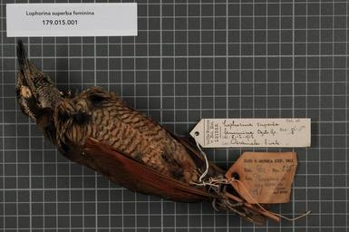 | Keywords: Naturalis Biodiversity Center - RMNH.AVES.140796 1 - Lophorina superba feminina Grant, 1915 - Paradisaeidae - bird skin specimen.jpeg artwork Dimensions artwork Document type Paradisaeidae Lophorina Individual count 1 Infraspecific epithet feminina Infraspecific rank Institution Naturalis Kind of unit artwork Kind of unit specimen skin Life stage Perameles-bivak Medium artwork Nomenclatural code Sex remark On RMNH-label first female changed into male Occurrence ID page Other fields Other versions artwork Permission license Naturalis donation CC-0 Publication location Scientific name Lophorina superba feminina Grant 1915 Scientific name authorship Grant 1915 male Source url http //bioportal naturalis nl Specific epithet superba State or province Subject keywords artwork Subject keywords publication Title artwork Title publication Type status Uploaded with GWToolset Naturalis_Biodiversity_Center_-_RMNH AVES 140796_1_-_Lophorina_superba_feminina_Grant _1915_-_Paradisaeidae_-_bird_skin_specimen http //medialib naturalis nl/file/id/RMNH AVES 140796_1/format/large Media donated by Naturalis Biodiversity Center Songbird specimens at Naturalis Biodiversity Center Lophorina superba Lophorina |