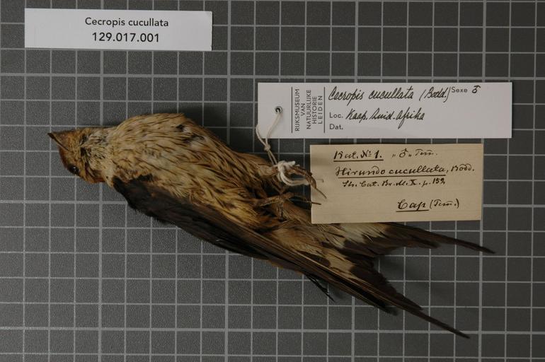 Keywords: Naturalis Biodiversity Center - RMNH.AVES.125118 1 - Cecropis cucullata (Boddaert, 1783) - Hirundinidae - bird skin specimen.jpeg artwork Dimensions artwork Document type Hirundinidae Cecropis Individual count 1 Infraspecific epithet Infraspecific rank Institution Naturalis Kind of unit artwork Kind of unit specimen skin Life stage Zuid Afrika Kaap Medium artwork Nomenclatural code Additional label info H capensis Lath Viell Pl 245 F 1 Cap d B E old label by Temminck Sex remark male Temm Occurrence ID page Other fields Other versions artwork Permission license Naturalis donation CC-0 Publication location Scientific name Cecropis cucullata Boddaert 1783 Scientific name authorship Boddaert 1783 male Source url http //bioportal naturalis nl Specific epithet cucullata State or province Kaap Subject keywords artwork Subject keywords publication Title artwork Title publication Type status Uploaded with GWToolset Naturalis_Biodiversity_Center_-_RMNH AVES 125118_1_-_Cecropis_cucullata_ Boddaert _1783 _-_Hirundinidae_-_bird_skin_specimen http //medialib naturalis nl/file/id/RMNH AVES 125118_1/format/large Media donated by Naturalis Biodiversity Center Songbird specimens at Naturalis Biodiversity Center Cecropis cucullata museum specimens |