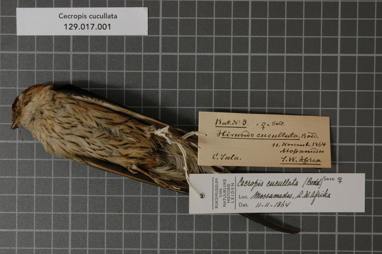 Keywords: Naturalis Biodiversity Center - RMNH.AVES.125123 1 - Cecropis cucullata (Boddaert, 1783) - Hirundinidae - bird skin specimen.jpeg artwork Dimensions artwork Document type Hirundinidae Cecropis Individual count 1 Infraspecific epithet Infraspecific rank Institution Naturalis Kind of unit artwork Kind of unit specimen skin Life stage Z W Afrika Mossamedes Medium artwork Nomenclatural code Additional identification info NB War unbestimmt Sex remark female Coll Occurrence ID page Other fields Other versions artwork Permission license Naturalis donation CC-0 Publication location Scientific name Cecropis cucullata Boddaert 1783 Scientific name authorship Boddaert 1783 female Source url http //bioportal naturalis nl Specific epithet cucullata State or province Subject keywords artwork Subject keywords publication Title artwork Title publication Type status Uploaded with GWToolset Naturalis_Biodiversity_Center_-_RMNH AVES 125123_1_-_Cecropis_cucullata_ Boddaert _1783 _-_Hirundinidae_-_bird_skin_specimen http //medialib naturalis nl/file/id/RMNH AVES 125123_1/format/large Media donated by Naturalis Biodiversity Center Songbird specimens at Naturalis Biodiversity Center Cecropis cucullata museum specimens |