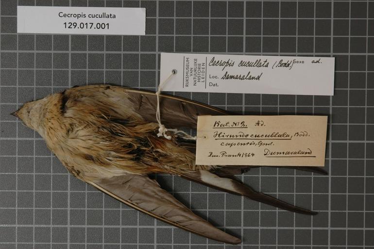 Keywords: Naturalis Biodiversity Center - RMNH.AVES.125120 1 - Cecropis cucullata (Boddaert, 1783) - Hirundinidae - bird skin specimen.jpeg artwork Dimensions artwork Document type Hirundinidae Cecropis Individual count 1 Infraspecific epithet Infraspecific rank Institution Naturalis Kind of unit artwork Kind of unit specimen skin Life stage adult Damaraland Medium artwork Nomenclatural code Additional identification info NB War unbestimmt Occurrence ID page Other fields Other versions artwork Permission license Naturalis donation CC-0 Publication location Scientific name Cecropis cucullata Boddaert 1783 Scientific name authorship Boddaert 1783 Source url http //bioportal naturalis nl Specific epithet cucullata State or province Damaraland Subject keywords artwork Subject keywords publication Title artwork Title publication Type status Uploaded with GWToolset Naturalis_Biodiversity_Center_-_RMNH AVES 125120_1_-_Cecropis_cucullata_ Boddaert _1783 _-_Hirundinidae_-_bird_skin_specimen http //medialib naturalis nl/file/id/RMNH AVES 125120_1/format/large Media donated by Naturalis Biodiversity Center Songbird specimens at Naturalis Biodiversity Center Cecropis cucullata museum specimens |