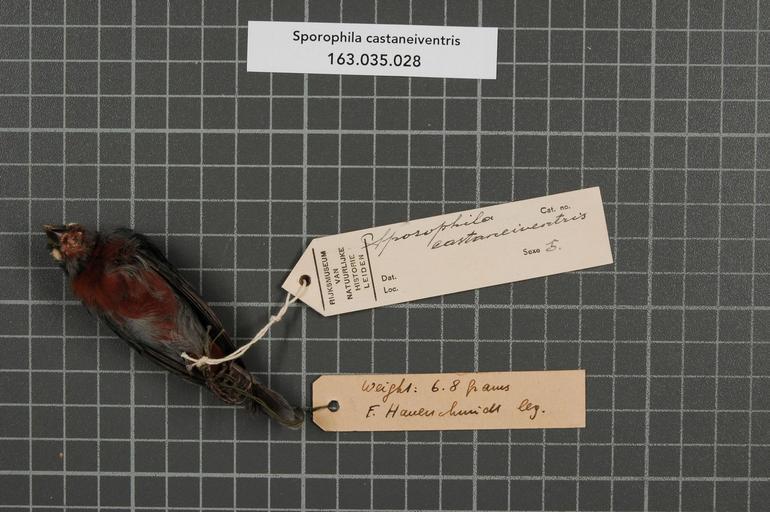 Keywords: Naturalis Biodiversity Center - RMNH.AVES.14687 2 - Sporophila castaneiventris Cabanis, 1849 - Emberizidae - bird skin specimen.jpeg artwork Dimensions artwork Document type Emberizidae Sporophila Individual count 1 Infraspecific epithet Infraspecific rank Institution Naturalis Kind of unit artwork Kind of unit specimen skin Life stage Surinam Republiek Medium artwork Nomenclatural code Occurrence ID page Other fields Other versions artwork Permission license Naturalis donation CC-0 Publication location Scientific name Sporophila castaneiventris Cabanis 1849 Scientific name authorship Cabanis 1849 male Source url http //bioportal naturalis nl Specific epithet castaneiventris State or province Subject keywords artwork Subject keywords publication Title artwork Title publication Type status Uploaded with GWToolset Naturalis_Biodiversity_Center_-_RMNH AVES 14687_2_-_Sporophila_castaneiventris_Cabanis _1849_-_Emberizidae_-_bird_skin_specimen http //medialib naturalis nl/file/id/RMNH AVES 14687_2/format/large Media donated by Naturalis Biodiversity Center Songbird specimens at Naturalis Biodiversity Center Sporophila Sporophila castaneiventris |
