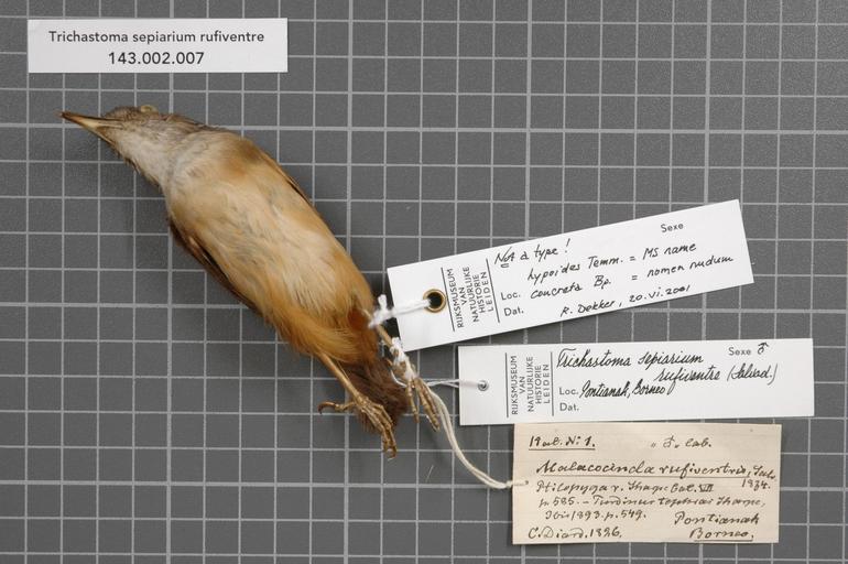| Keywords: Naturalis Biodiversity Center - RMNH.AVES.147063 1 - Trichastoma sepiarium rufiventre (Salvadori, 1874) - Timaliidae - bird skin specimen.jpeg artwork Dimensions artwork Document type Timaliidae Trichastoma Individual count 1 Infraspecific epithet rufiventre Infraspecific rank Institution Naturalis Kind of unit artwork Kind of unit specimen skin Life stage Indonesia Borneo Pontianak Medium artwork Nomenclatural code Check type ADDITIONAL identification info hypoides Temm MS name concreta Bp nomen nudum R Dekker 20 VI 2001 Sex remark On original label male lab Occurrence ID page Other fields Other versions artwork Permission license Naturalis donation CC-0 Publication location Scientific name Trichastoma sepiarium rufiventre Salvadori 1874 Scientific name authorship Salvadori 1874 male Source url http //bioportal naturalis nl Specific epithet sepiarium State or province Subject keywords artwork Subject keywords publication Title artwork Title publication Type status Uploaded with GWToolset Naturalis_Biodiversity_Center_-_RMNH AVES 147063_1_-_Trichastoma_sepiarium_rufiventre_ Salvadori _1874 _-_Timaliidae_-_bird_skin_specimen http //medialib naturalis nl/file/id/RMNH AVES 147063_1/format/large Media donated by Naturalis Biodiversity Center Songbird specimens at Naturalis Biodiversity Center Trichastoma Trichastoma sepiarium |