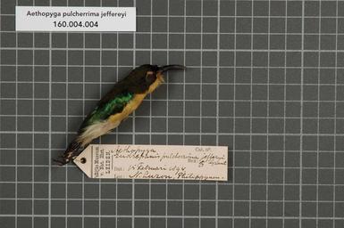| Keywords: Naturalis Biodiversity Center - RMNH.AVES.150768 1 - Aethopyga pulcherrima jeffereyi (Ogilvie-Grant, 1894) - Nectariniidae - bird skin specimen.jpeg artwork Dimensions artwork Document type Nectariniidae Aethopyga Individual count 1 Infraspecific epithet jeffereyi Infraspecific rank Institution Naturalis Kind of unit artwork Kind of unit specimen skin Life stage Philippijnen N Luzon Medium artwork Nomenclatural code Occurrence ID page Other fields Other versions artwork Permission license Naturalis donation CC-0 Publication location Scientific name Aethopyga pulcherrima jeffereyi Ogilvie-Grant 1894 Scientific name authorship Ogilvie-Grant 1894 male Source url http //bioportal naturalis nl Specific epithet pulcherrima State or province N Luzon Subject keywords artwork Subject keywords publication Title artwork Title publication Type status Uploaded with GWToolset Naturalis_Biodiversity_Center_-_RMNH AVES 150768_1_-_Aethopyga_pulcherrima_jeffereyi_ Ogilvie-Grant _1894 _-_Nectariniidae_-_bird_skin_specimen http //medialib naturalis nl/file/id/RMNH AVES 150768_1/format/large Media donated by Naturalis Biodiversity Center Songbird specimens at Naturalis Biodiversity Center Aethopyga Aethopyga pulcherrima |