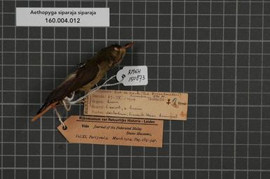 | Keywords: Naturalis Biodiversity Center - RMNH.AVES.150873 1 - Aethopyga siparaja siparaja (Raffles, 1822) - Nectariniidae - bird skin specimen.jpeg artwork Dimensions artwork Document type Nectariniidae Aethopyga Individual count 1 Infraspecific epithet siparaja Infraspecific rank Institution Naturalis Kind of unit artwork Kind of unit specimen skin Life stage Indonesia Sumatra Pad Bovenlanden Fort de Kock Medium artwork Nomenclatural code Sex remark On original label female male imm Occurrence ID page Other fields Other versions artwork Permission license Naturalis donation CC-0 Publication location Scientific name Aethopyga siparaja siparaja Raffles 1822 Scientific name authorship Raffles 1822 Source url http //bioportal naturalis nl Specific epithet siparaja State or province Sumatra Pad Bovenlanden Subject keywords artwork Subject keywords publication Title artwork Title publication Type status Uploaded with GWToolset Naturalis_Biodiversity_Center_-_RMNH AVES 150873_1_-_Aethopyga_siparaja_siparaja_ Raffles _1822 _-_Nectariniidae_-_bird_skin_specimen http //medialib naturalis nl/file/id/RMNH AVES 150873_1/format/large Media donated by Naturalis Biodiversity Center Songbird specimens at Naturalis Biodiversity Center Aethopyga Aethopyga siparaja |
