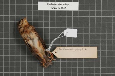 | Keywords: Naturalis Biodiversity Center - RMNH.AVES.151576 2 - Euplectes afer subsp. - Ploceidae - bird skin specimen.jpeg artwork Dimensions artwork Document type Ploceidae Euplectes Individual count 1 Infraspecific epithet subsp Infraspecific rank Institution Naturalis Kind of unit artwork Kind of unit specimen skin Life stage Medium artwork Nomenclatural code Occurrence ID page Other fields Other versions artwork Permission license Naturalis donation CC-0 Publication location Scientific name Euplectes afer subsp Scientific name authorship male Source url http //bioportal naturalis nl Specific epithet afer State or province Subject keywords artwork Subject keywords publication Title artwork Title publication Type status Uploaded with GWToolset Naturalis_Biodiversity_Center_-_RMNH AVES 151576_2_-_Euplectes_afer_subsp _-_Ploceidae_-_bird_skin_specimen http //medialib naturalis nl/file/id/RMNH AVES 151576_2/format/large Media donated by Naturalis Biodiversity Center Songbird specimens at Naturalis Biodiversity Center Euplectes afer Euplectes |