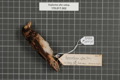 | Keywords: Naturalis Biodiversity Center - RMNH.AVES.151575 1 - Euplectes afer subsp. - Ploceidae - bird skin specimen.jpeg artwork Dimensions artwork Document type Ploceidae Euplectes Individual count 1 Infraspecific epithet subsp Infraspecific rank Institution Naturalis Kind of unit artwork Kind of unit specimen skin Life stage Medium artwork Nomenclatural code Occurrence ID page Other fields Other versions artwork Permission license Naturalis donation CC-0 Publication location Scientific name Euplectes afer subsp Scientific name authorship female Source url http //bioportal naturalis nl Specific epithet afer State or province Subject keywords artwork Subject keywords publication Title artwork Title publication Type status Uploaded with GWToolset Naturalis_Biodiversity_Center_-_RMNH AVES 151575_1_-_Euplectes_afer_subsp _-_Ploceidae_-_bird_skin_specimen http //medialib naturalis nl/file/id/RMNH AVES 151575_1/format/large Media donated by Naturalis Biodiversity Center Songbird specimens at Naturalis Biodiversity Center Euplectes afer Euplectes |
