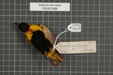 | Keywords: Naturalis Biodiversity Center - RMNH.AVES.151578 1 - Euplectes afer subsp. - Ploceidae - bird skin specimen.jpeg artwork Dimensions artwork Document type Ploceidae Euplectes Individual count 1 Infraspecific epithet subsp Infraspecific rank Institution Naturalis Kind of unit artwork Kind of unit specimen skin Life stage Afrika Medium artwork Nomenclatural code Occurrence ID page Other fields Other versions artwork Permission license Naturalis donation CC-0 Publication location Scientific name Euplectes afer subsp Scientific name authorship male Source url http //bioportal naturalis nl Specific epithet afer State or province Subject keywords artwork Subject keywords publication Title artwork Title publication Type status Uploaded with GWToolset Naturalis_Biodiversity_Center_-_RMNH AVES 151578_1_-_Euplectes_afer_subsp _-_Ploceidae_-_bird_skin_specimen http //medialib naturalis nl/file/id/RMNH AVES 151578_1/format/large Media donated by Naturalis Biodiversity Center Songbird specimens at Naturalis Biodiversity Center Euplectes afer Euplectes |
