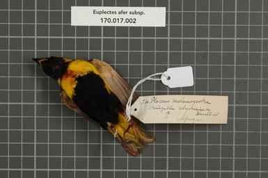 | Keywords: Naturalis Biodiversity Center - RMNH.AVES.151578 2 - Euplectes afer subsp. - Ploceidae - bird skin specimen.jpeg artwork Dimensions artwork Document type Ploceidae Euplectes Individual count 1 Infraspecific epithet subsp Infraspecific rank Institution Naturalis Kind of unit artwork Kind of unit specimen skin Life stage Afrika Medium artwork Nomenclatural code Occurrence ID page Other fields Other versions artwork Permission license Naturalis donation CC-0 Publication location Scientific name Euplectes afer subsp Scientific name authorship male Source url http //bioportal naturalis nl Specific epithet afer State or province Subject keywords artwork Subject keywords publication Title artwork Title publication Type status Uploaded with GWToolset Naturalis_Biodiversity_Center_-_RMNH AVES 151578_2_-_Euplectes_afer_subsp _-_Ploceidae_-_bird_skin_specimen http //medialib naturalis nl/file/id/RMNH AVES 151578_2/format/large Media donated by Naturalis Biodiversity Center Songbird specimens at Naturalis Biodiversity Center Euplectes afer Euplectes |
