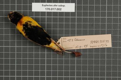 | Keywords: Naturalis Biodiversity Center - RMNH.AVES.151579 2 - Euplectes afer subsp. - Ploceidae - bird skin specimen.jpeg artwork Dimensions artwork Document type Ploceidae Euplectes Individual count 1 Infraspecific epithet subsp Infraspecific rank Institution Naturalis Kind of unit artwork Kind of unit specimen skin Life stage Medium artwork Nomenclatural code Occurrence ID page Other fields Other versions artwork Permission license Naturalis donation CC-0 Publication location Scientific name Euplectes afer subsp Scientific name authorship male Source url http //bioportal naturalis nl Specific epithet afer State or province Subject keywords artwork Subject keywords publication Title artwork Title publication Type status Uploaded with GWToolset Naturalis_Biodiversity_Center_-_RMNH AVES 151579_2_-_Euplectes_afer_subsp _-_Ploceidae_-_bird_skin_specimen http //medialib naturalis nl/file/id/RMNH AVES 151579_2/format/large Media donated by Naturalis Biodiversity Center Songbird specimens at Naturalis Biodiversity Center Euplectes afer Euplectes |