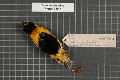 | Keywords: Naturalis Biodiversity Center - RMNH.AVES.151580 2 - Euplectes afer subsp. - Ploceidae - bird skin specimen.jpeg artwork Dimensions artwork Document type Ploceidae Euplectes Individual count 1 Infraspecific epithet subsp Infraspecific rank Institution Naturalis Kind of unit artwork Kind of unit specimen skin Life stage Medium artwork Nomenclatural code Occurrence ID page Other fields Other versions artwork Permission license Naturalis donation CC-0 Publication location Scientific name Euplectes afer subsp Scientific name authorship male Source url http //bioportal naturalis nl Specific epithet afer State or province Subject keywords artwork Subject keywords publication Title artwork Title publication Type status Uploaded with GWToolset Naturalis_Biodiversity_Center_-_RMNH AVES 151580_2_-_Euplectes_afer_subsp _-_Ploceidae_-_bird_skin_specimen http //medialib naturalis nl/file/id/RMNH AVES 151580_2/format/large Media donated by Naturalis Biodiversity Center Songbird specimens at Naturalis Biodiversity Center Euplectes afer Euplectes |