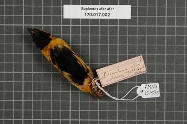 | Keywords: Naturalis Biodiversity Center - RMNH.AVES.151585 1 - Euplectes afer afer Gmelin, 1789 - Ploceidae - bird skin specimen.jpeg artwork Dimensions artwork Document type Ploceidae Euplectes Individual count 1 Infraspecific epithet afer Infraspecific rank Institution Naturalis Kind of unit artwork Kind of unit specimen skin Life stage Gold Coast Medium artwork Nomenclatural code Occurrence ID page Other fields Other versions artwork Permission license Naturalis donation CC-0 Publication location Scientific name Euplectes afer afer Gmelin 1789 Scientific name authorship Gmelin 1789 male Source url http //bioportal naturalis nl Specific epithet afer State or province Subject keywords artwork Subject keywords publication Title artwork Title publication Type status Uploaded with GWToolset Naturalis_Biodiversity_Center_-_RMNH AVES 151585_1_-_Euplectes_afer_afer_Gmelin _1789_-_Ploceidae_-_bird_skin_specimen http //medialib naturalis nl/file/id/RMNH AVES 151585_1/format/large Media donated by Naturalis Biodiversity Center Songbird specimens at Naturalis Biodiversity Center Euplectes afer Euplectes |