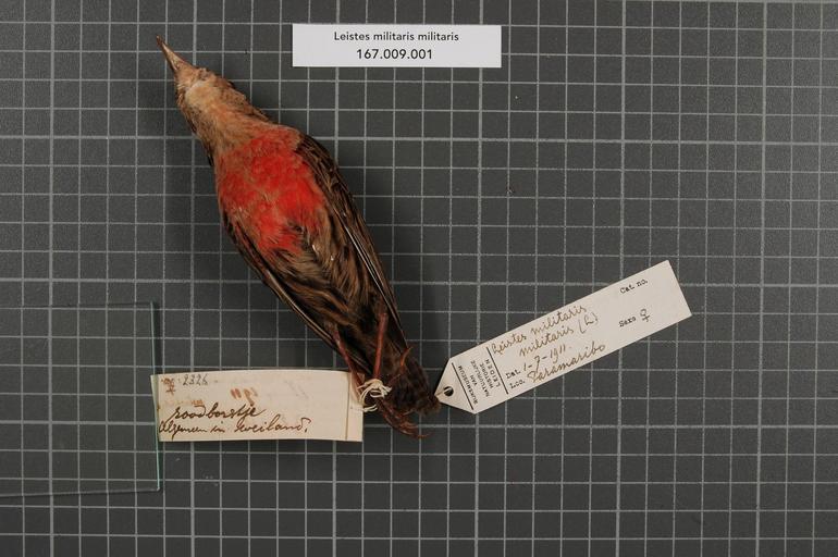 Keywords: Naturalis Biodiversity Center - RMNH.AVES.153536 2 - Leistes militaris militaris (Linnaeus, 1758) - Icteridae - bird skin specimen.jpeg artwork Dimensions artwork Document type Icteridae Leistes Individual count 1 Infraspecific epithet militaris Infraspecific rank Institution Naturalis Kind of unit artwork Kind of unit specimen skin Life stage Suriname Paramaribo Medium artwork Nomenclatural code Sex remark on label Mees f male geschlachtsrijp Occurrence ID page Other fields Other versions artwork Permission license Naturalis donation CC-0 Publication location Scientific name Leistes militaris militaris Linnaeus 1758 Scientific name authorship Linnaeus 1758 female Source url http //bioportal naturalis nl Specific epithet militaris State or province Subject keywords artwork Subject keywords publication Title artwork Title publication Type status Uploaded with GWToolset Naturalis_Biodiversity_Center_-_RMNH AVES 153536_2_-_Leistes_militaris_militaris_ Linnaeus _1758 _-_Icteridae_-_bird_skin_specimen http //medialib naturalis nl/file/id/RMNH AVES 153536_2/format/large Media donated by Naturalis Biodiversity Center Songbird specimens at Naturalis Biodiversity Center Sturnella militaris |