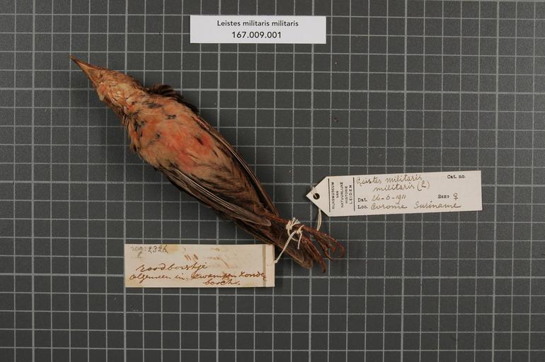 Keywords: Naturalis Biodiversity Center - RMNH.AVES.153537 2 - Leistes militaris militaris (Linnaeus, 1758) - Icteridae - bird skin specimen.jpeg artwork Dimensions artwork Document type Icteridae Leistes Individual count 1 Infraspecific epithet militaris Infraspecific rank Institution Naturalis Kind of unit artwork Kind of unit specimen skin Life stage Suriname Coronie Medium artwork Nomenclatural code Occurrence ID page Other fields Other versions artwork Permission license Naturalis donation CC-0 Publication location Scientific name Leistes militaris militaris Linnaeus 1758 Scientific name authorship Linnaeus 1758 female Source url http //bioportal naturalis nl Specific epithet militaris State or province Coronie Subject keywords artwork Subject keywords publication Title artwork Title publication Type status Uploaded with GWToolset Naturalis_Biodiversity_Center_-_RMNH AVES 153537_2_-_Leistes_militaris_militaris_ Linnaeus _1758 _-_Icteridae_-_bird_skin_specimen http //medialib naturalis nl/file/id/RMNH AVES 153537_2/format/large Media donated by Naturalis Biodiversity Center Songbird specimens at Naturalis Biodiversity Center Sturnella militaris |