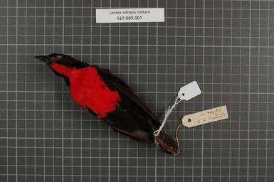 | Keywords: Naturalis Biodiversity Center - RMNH.AVES.153541 2 - Leistes militaris militaris (Linnaeus, 1758) - Icteridae - bird skin specimen.jpeg artwork Dimensions artwork Document type Icteridae Leistes Individual count 1 Infraspecific epithet militaris Infraspecific rank Institution Naturalis Kind of unit artwork Kind of unit specimen skin Life stage Brit Guyana Berbice Medium artwork Nomenclatural code Occurrence ID page Other fields Other versions artwork Permission license Naturalis donation CC-0 Publication location Scientific name Leistes militaris militaris Linnaeus 1758 Scientific name authorship Linnaeus 1758 male Source url http //bioportal naturalis nl Specific epithet militaris State or province Subject keywords artwork Subject keywords publication Title artwork Title publication Type status Uploaded with GWToolset Naturalis_Biodiversity_Center_-_RMNH AVES 153541_2_-_Leistes_militaris_militaris_ Linnaeus _1758 _-_Icteridae_-_bird_skin_specimen http //medialib naturalis nl/file/id/RMNH AVES 153541_2/format/large Media donated by Naturalis Biodiversity Center Songbird specimens at Naturalis Biodiversity Center Sturnella militaris |