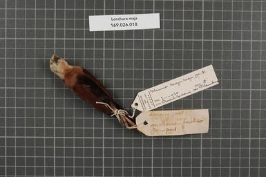 | Keywords: Naturalis Biodiversity Center - RMNH.AVES.161194 2 - Lonchura maja (Linnaeus, 1766) - Estrildidae - bird skin specimen.jpeg artwork Dimensions artwork Document type Estrildidae Lonchura Individual count 1 Infraspecific epithet Infraspecific rank Institution Naturalis Kind of unit artwork Kind of unit specimen skin Life stage Boekit Gadang res Palembang Medium artwork Nomenclatural code General remarks more information on original label in other languAge Occurrence ID page Other fields Other versions artwork Permission license Naturalis donation CC-0 Publication location Scientific name Lonchura maja Linnaeus 1766 Scientific name authorship Linnaeus 1766 male Source url http //bioportal naturalis nl Specific epithet maja State or province Subject keywords artwork Subject keywords publication Title artwork Title publication Type status Uploaded with GWToolset Naturalis_Biodiversity_Center_-_RMNH AVES 161194_2_-_Lonchura_maja_ Linnaeus _1766 _-_Estrildidae_-_bird_skin_specimen http //medialib naturalis nl/file/id/RMNH AVES 161194_2/format/large Media donated by Naturalis Biodiversity Center Songbird specimens at Naturalis Biodiversity Center Lonchura maja Lonchura |