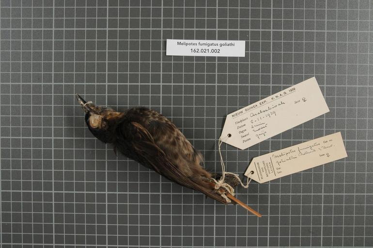 | Keywords: Naturalis Biodiversity Center - RMNH.AVES.19140 1 - Melipotes fumigatus goliathi Rothschild and Hartert, 1911 - Meliphagidae - bird skin specimen.jpeg artwork Dimensions artwork Document type Meliphagidae Melipotes Individual count 1 Infraspecific epithet goliathi Infraspecific rank Institution Naturalis Kind of unit artwork Kind of unit specimen skin Life stage Araboebivak Medium artwork Nomenclatural code Occurrence ID page Other fields Other versions artwork Permission license Naturalis donation CC-0 Publication location Scientific name Melipotes fumigatus goliathi Rothschild and Hartert 1911 Scientific name authorship Rothschild and Hartert 1911 female Source url http //bioportal naturalis nl Specific epithet fumigatus State or province Subject keywords artwork Subject keywords publication Title artwork Title publication Type status Uploaded with GWToolset Naturalis_Biodiversity_Center_-_RMNH AVES 19140_1_-_Melipotes_fumigatus_goliathi_Rothschild_and_Hartert _1911_-_Meliphagidae_-_bird_skin_specimen http //medialib naturalis nl/file/id/RMNH AVES 19140_1/format/large Media donated by Naturalis Biodiversity Center Songbird specimens at Naturalis Biodiversity Center Melipotes fumigatus Melipotes |