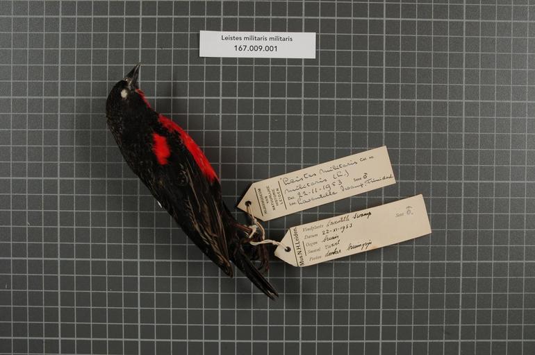 Keywords: Naturalis Biodiversity Center - RMNH.AVES.21597 1 - Leistes militaris militaris (Linnaeus, 1758) - Icteridae - bird skin specimen.jpeg artwork Dimensions artwork Document type Icteridae Leistes Individual count 1 Infraspecific epithet militaris Infraspecific rank Institution Naturalis Kind of unit artwork Kind of unit specimen skin Life stage Trinidad Laventille Swamp Medium artwork Nomenclatural code Occurrence ID page Other fields Other versions artwork Permission license Naturalis donation CC-0 Publication location Scientific name Leistes militaris militaris Linnaeus 1758 Scientific name authorship Linnaeus 1758 male Source url http //bioportal naturalis nl Specific epithet militaris State or province Subject keywords artwork Subject keywords publication Title artwork Title publication Type status Uploaded with GWToolset Naturalis_Biodiversity_Center_-_RMNH AVES 21597_1_-_Leistes_militaris_militaris_ Linnaeus _1758 _-_Icteridae_-_bird_skin_specimen http //medialib naturalis nl/file/id/RMNH AVES 21597_1/format/large Media donated by Naturalis Biodiversity Center Songbird specimens at Naturalis Biodiversity Center Sturnella militaris |