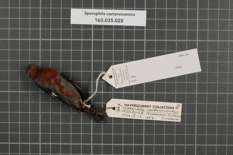 Keywords: Naturalis Biodiversity Center - RMNH.AVES.22271 2 - Sporophila castaneiventris Cabanis, 1849 - Emberizidae - bird skin specimen.jpeg artwork Dimensions artwork Document type Emberizidae Sporophila Individual count 1 Infraspecific epithet Infraspecific rank Institution Naturalis Kind of unit artwork Kind of unit specimen skin Life stage Surinam Marowijne District Negerkreek Medium artwork Nomenclatural code Occurrence ID page Other fields Other versions artwork Permission license Naturalis donation CC-0 Publication location Scientific name Sporophila castaneiventris Cabanis 1849 Scientific name authorship Cabanis 1849 male Source url http //bioportal naturalis nl Specific epithet castaneiventris State or province Marowijne District Subject keywords artwork Subject keywords publication Title artwork Title publication Type status Uploaded with GWToolset Naturalis_Biodiversity_Center_-_RMNH AVES 22271_2_-_Sporophila_castaneiventris_Cabanis _1849_-_Emberizidae_-_bird_skin_specimen http //medialib naturalis nl/file/id/RMNH AVES 22271_2/format/large Media donated by Naturalis Biodiversity Center Songbird specimens at Naturalis Biodiversity Center Sporophila castaneiventris Sporophila |