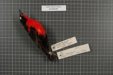 | Keywords: Naturalis Biodiversity Center - RMNH.AVES.25609 1 - Leistes militaris militaris (Linnaeus, 1758) - Icteridae - bird skin specimen.jpeg artwork Dimensions artwork Document type Icteridae Leistes Individual count 1 Infraspecific epithet militaris Infraspecific rank Institution Naturalis Kind of unit artwork Kind of unit specimen skin Life stage Surinam Paramaribo Medium artwork Nomenclatural code Occurrence ID page Other fields Other versions artwork Permission license Naturalis donation CC-0 Publication location Scientific name Leistes militaris militaris Linnaeus 1758 Scientific name authorship Linnaeus 1758 male Source url http //bioportal naturalis nl Specific epithet militaris State or province Subject keywords artwork Subject keywords publication Title artwork Title publication Type status Uploaded with GWToolset Naturalis_Biodiversity_Center_-_RMNH AVES 25609_1_-_Leistes_militaris_militaris_ Linnaeus _1758 _-_Icteridae_-_bird_skin_specimen http //medialib naturalis nl/file/id/RMNH AVES 25609_1/format/large Media donated by Naturalis Biodiversity Center Songbird specimens at Naturalis Biodiversity Center Sturnella militaris |