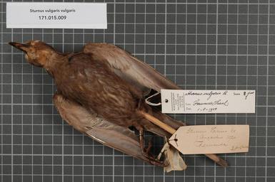 | Keywords: Naturalis Biodiversity Center - RMNH.AVES.32225 1 - Sturnus vulgaris vulgaris Linnaeus, 1758 - Sturnidae - bird skin specimen.jpeg artwork Dimensions artwork Document type Sturnidae Sturnus Individual count 1 Infraspecific epithet vulgaris Infraspecific rank Institution Naturalis Kind of unit artwork Kind of unit specimen skin Life stage juvenile Netherlands Friesland Ferwoude Medium artwork Nomenclatural code General remarks Bone attachedAge remark On original label female juv sectie ADDITIONAL preparation info G v/d Meer praep; Huid borstbeen femur Occurrence ID page Other fields Other versions artwork Permission license Naturalis donation CC-0 Publication location Scientific name Sturnus vulgaris vulgaris Linnaeus 1758 Scientific name authorship Linnaeus 1758 female Source url http //bioportal naturalis nl Specific epithet vulgaris State or province Friesland Subject keywords artwork Subject keywords publication Title artwork Title publication Type status Uploaded with GWToolset Naturalis_Biodiversity_Center_-_RMNH AVES 32225_1_-_Sturnus_vulgaris_vulgaris_Linnaeus _1758_-_Sturnidae_-_bird_skin_specimen http //medialib naturalis nl/file/id/RMNH AVES 32225_1/format/large Media donated by Naturalis Biodiversity Center Songbird specimens at Naturalis Biodiversity Center Sturnus vulgaris museum specimens |