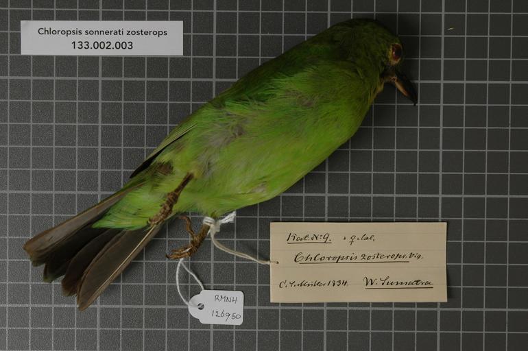 Keywords: Naturalis Biodiversity Center - RMNH.AVES.126950 1 - Chloropsis sonnerati zosterops Vigors & Horsfield, 1830 - Irenidae - bird skin specimen.jpeg artwork Dimensions artwork Document type Irenidae Chloropsis Individual count 1 Infraspecific epithet zosterops Infraspecific rank Kind of unit artwork Kind of unit specimen skin Life stage Indonesia W Sumatra Medium artwork Nomenclatural code Additional label info Phyllornis Sonnerat Selb Hl 100 Mulleri Temm Pl col female Sumatra orig lab by Temminck Sex remark on label female lab Occurrence ID Other fields Other versions artwork Permission license Naturalis donation CC-0 Publication location Scientific name Chloropsis sonnerati zosterops Vigors Horsfield 1830 Scientific name authorship Vigors Horsfield 1830 female Source url Specific epithet sonnerati State or province W Sumatra Subject keywords artwork Subject keywords publication Title artwork Title publication Type status Uploaded with GWToolset Naturalis_Biodiversity_Center_-_RMNH AVES 126950_1_-_Chloropsis_sonnerati_zosterops_Vigors_ _Horsfield _1830_-_Irenidae_-_bird_skin_specimen http //medialib naturalis nl/file/id/RMNH AVES 126950_1/format/large Media donated by Naturalis Biodiversity Center Songbird specimens at Naturalis Biodiversity Center Chloropsis sonnerati Chloropsis |