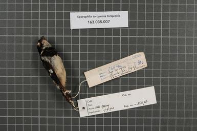 | Keywords: Naturalis Biodiversity Center - RMNH.AVES.35078 1 - Sporophila torqueola torqueola (Bonaparte, 1851) - Emberizidae - bird skin specimen.jpeg artwork Dimensions artwork Document type Emberizidae Sporophila Individual count 1 Infraspecific epithet torqueola Infraspecific rank Institution Naturalis Kind of unit artwork Kind of unit specimen skin Life stage Oaxaca Loma Bonita Rancho Las Vegas Medium artwork Nomenclatural code Bodily condition Fett II Occurrence ID page Other fields Other versions artwork Permission license Naturalis donation CC-0 Publication location Scientific name Sporophila torqueola torqueola Bonaparte 1851 Scientific name authorship Bonaparte 1851 male Source url http //bioportal naturalis nl Specific epithet torqueola State or province Oaxaca Subject keywords artwork Subject keywords publication Title artwork Title publication Type status Uploaded with GWToolset Naturalis_Biodiversity_Center_-_RMNH AVES 35078_1_-_Sporophila_torqueola_torqueola_ Bonaparte _1851 _-_Emberizidae_-_bird_skin_specimen http //medialib naturalis nl/file/id/RMNH AVES 35078_1/format/large Media donated by Naturalis Biodiversity Center Songbird specimens at Naturalis Biodiversity Center Sporophila torqueola Sporophila |
